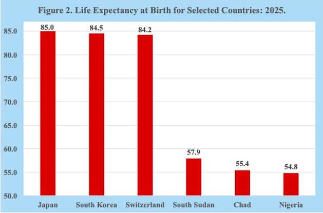 Por el contrario, países como Japón, Corea del Sur y Suiza presentan esperanzas de vida al nacer relativamente altas, aproximadamente 30 años mayores, alrededor de los 85 años (Gráfico 2).