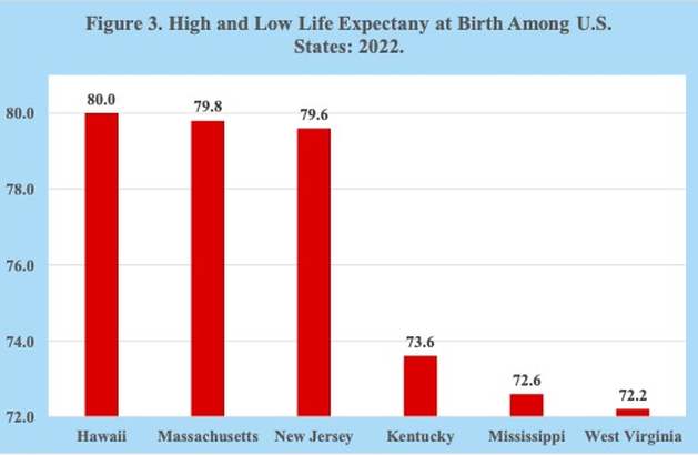 Existen variaciones en la mortalidad no solo entre países, sino también dentro de ellos. Por ejemplo, en 2022, la esperanza de vida al nacer en Estados Unidos varió desde máximos de aproximadamente 80 años en Hawái, Massachusetts y Nueva Jersey hasta mínimos de aproximadamente 73 años en Kentucky, Misisipi y Virginia Occidental (Gráfico 3).