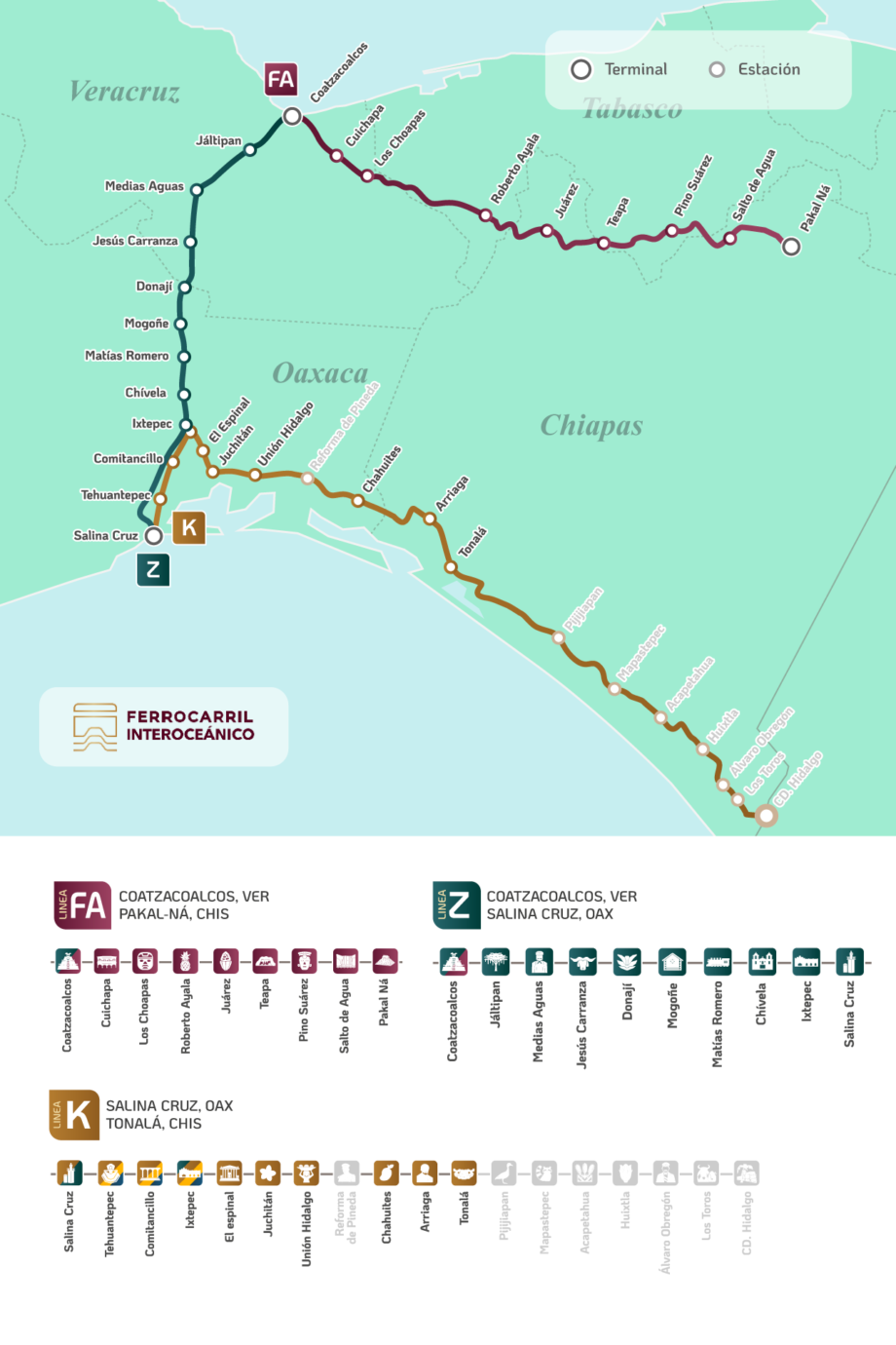 El FIT cuenta con la ruta Z, la principal y que conecta las costas del Pacífico y el Atlántico, a las que se enlazan en sus dos extremos dos ramales: FA y K. El FIT, cuya construcción arrancó en 2020 y opera desde fines de 2023, recorre más de 1000 kilómetros a lo largo de 29 estaciones, en una línea férrea con más de 100 años de existencia y que el gobierno decidió rehabilitar.